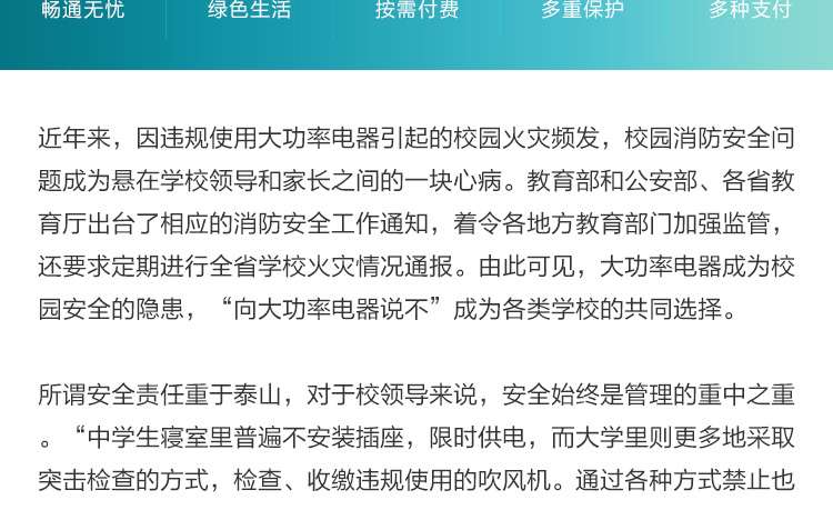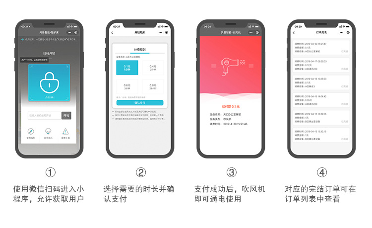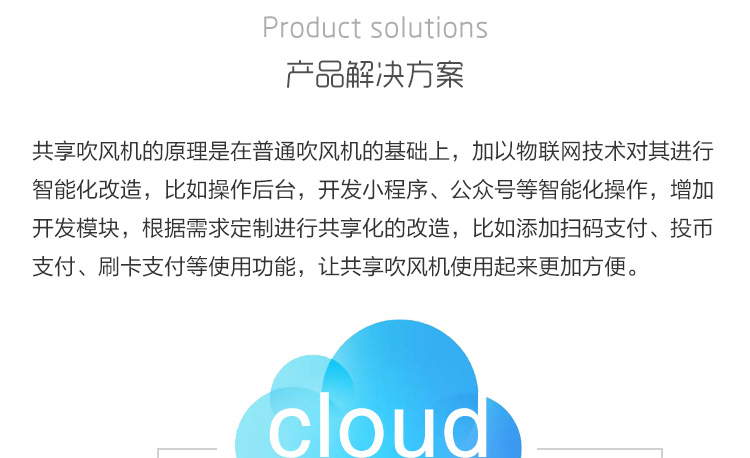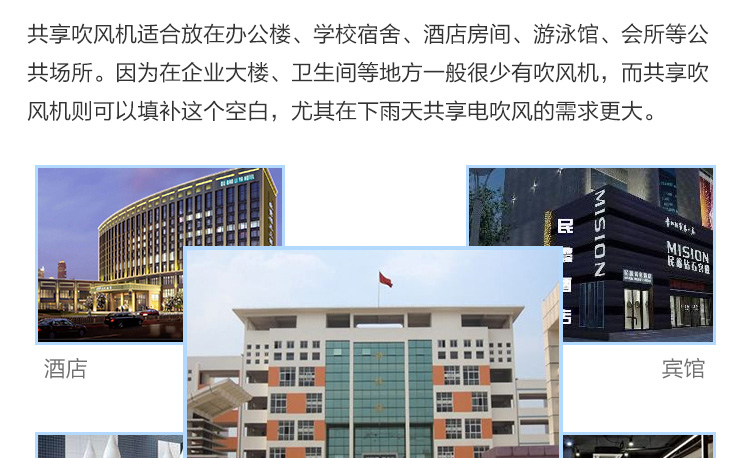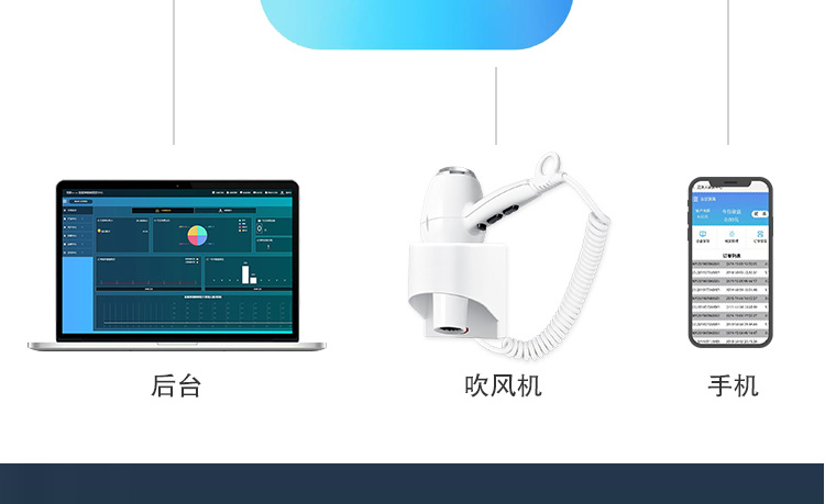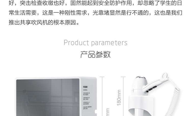 方案簡介: 為解決學校、工廠宿舍等人員居住量大的地方禁止使用大功率吹風機的問題,共享吹風機運營商可以跟學校協調進行統一安裝使用、統一管理,減少危險情況的發生。產品可使用掃碼、刷卡、投幣的支付方式,滿足各種場景所需。